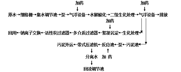 車間排放的污水先經(jīng)細(xì)格柵攔截沖洗下的廢毛線后集中進(jìn)入調(diào)節(jié)池,然后經(jīng)提升泵提到氣浮設(shè)備內(nèi)進(jìn)行預(yù)處理,降低水中懸浮物、有機(jī)物、色度,再經(jīng)酸化水解池提高污水可生化性,然后進(jìn)入生化曝氣池,經(jīng)沉淀池泥水分離,上清液再經(jīng)氣浮池處理進(jìn)一步降低廢水的有機(jī)物濃度后合格排放。另一部分水進(jìn)入回用水處理系統(tǒng),再經(jīng)過曝氣、加藥絮凝沉淀過濾、脫色后回用,污泥經(jīng)帶式壓濾機(jī)壓濾后集中處理。