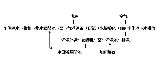 污水自流進入集水調節池,調節池前置格柵攔截大的顆粒,污水提升到氣浮設備內去除部份懸浮物、有機物;然后自流厭氧池,水解酸化池,分解污水中難降解的有機物到一定濃度,然后進入后續活性污泥池曝氣處理,再經沉淀后泥水分離。上清液經潷水器排放。底部多余活性污泥排入污泥池中,經污泥提升泵到疊螺機,同時投加藥劑,污泥擠壓后外運。